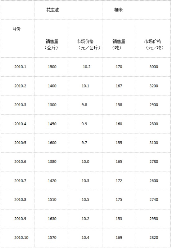 不定项选择题 某粮油零售市场2010年1月至10月花生油和粳米的销售量及其市场价格如表