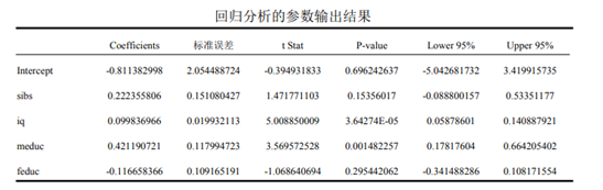 不定项选择题 为研究受教育年限受哪些因素的影响,国外某企业收集了 30 名职工的相关信息,分别是受教育年限(educ)、兄弟姐妹个数(sibs)、智商(iq)、母亲受教育年限(meduc)、父亲受教育年限(feduc)。数据描述及回归分析结果如下列图表所示:
