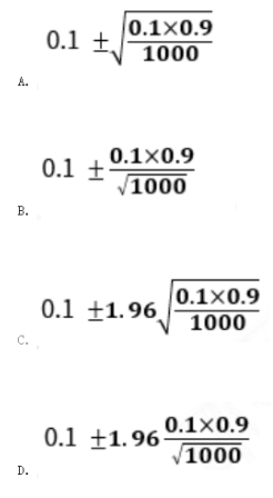 单选题 今从某地区抽取 1000 户居民家庭调查其每月的平均生活费用。按照当地贫困划分标准,其中有 100 户为贫困户,则贫困率 95%的置信区间为( )。(注:Z0.025= 1.96 )