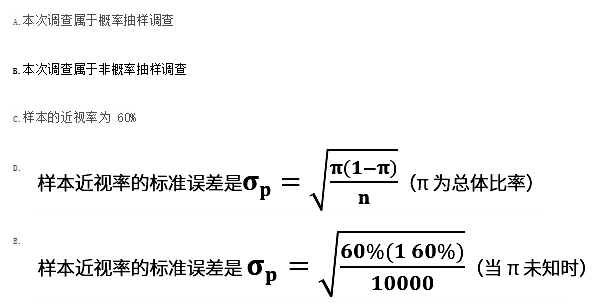 多选题 今从全市高中学生中随机抽取了 10000 名进行调查,发现有 6000 人近视。则( )。
