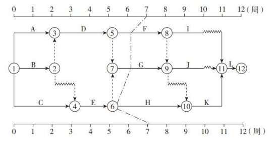 某工程时标网络计划实施至第 7 周末检查绘制的实际进度前锋线如下图所示,前锋线上各项工作实际进度及其影响程度正确的有()。
