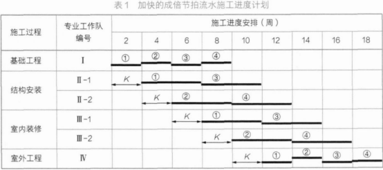 某工程由四幢相同的装配式单体建筑组成,每幢建筑可视为一个施工段,施工过程划分为基础工程、结构安装、室内装修和室外工程,编制的加快的成倍节拍流水施工进度计划见表1,正确的有( )。