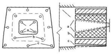 a—掏槽眼,b—辅助眼,c—周边眼。预裂爆破起爆顺序:周边眼→掏槽眼→辅助眼。