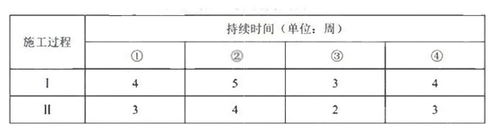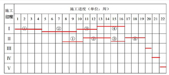 施工过程Ⅰ、Ⅱ在施工段上的持续时间,为无节奏流水施工,用“累加数列错位相减取大差”求得施工过程Ⅰ、Ⅱ的流水步距为7周。Ⅲ、Ⅳ、Ⅴ不分施工段连续施工,持续时间均为一周。