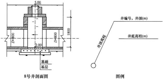 案例题 某公司承建一段新城镇道路,其雨水管道位于流砂地区,设计采用D800mm钢筋混凝土管,相邻井段间距40m,8号、9号雨水井段平面布置图及井室剖面如图所示,8号、9号井类型一致。