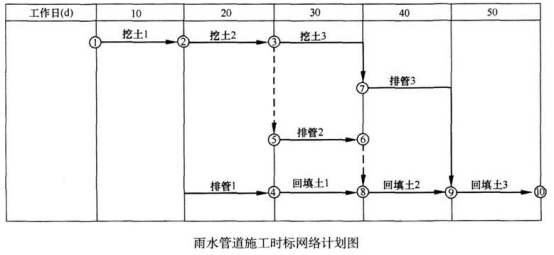 补全后的网络图中有6条关键线路。雨水管道施工总工期为50d。