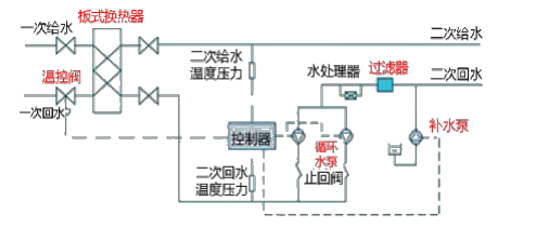 2.①:板式换热器;②:温控阀;③:补水泵;④:过滤器;⑤:循环水泵。