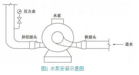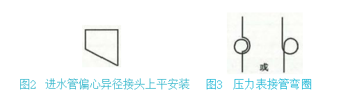 3. 水泵(图1)运行时会产生的不良后果:进水管的同心异径接头会形成气囊;压力表接管没有弯圈,压力表会有压力冲击而损坏。合格的返工部分示意图如图2、图3所示。