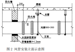 (2)风管穿过墙体时风管与防护套管之间采用水泥砂浆密封不符合规范要求;应采用不燃柔性材料封堵严密。