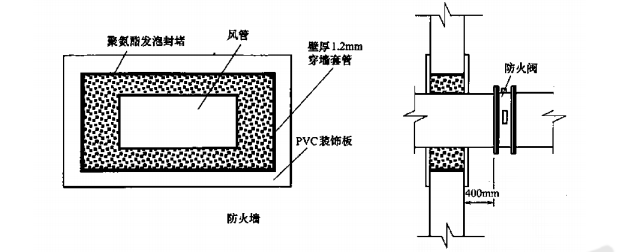(2)穿墙封堵材料应为不燃材料,而图中的聚氨醋及 PVC 装饰板,均为可燃材料。