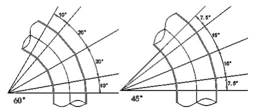 2.按照斜接弯头的组成形式的规定,如下图所示,对公称尺寸大于400mm的斜接弯头可增加中节数量。由此可得45°、60°弯头中间管节角度a值分别为15°、20°。