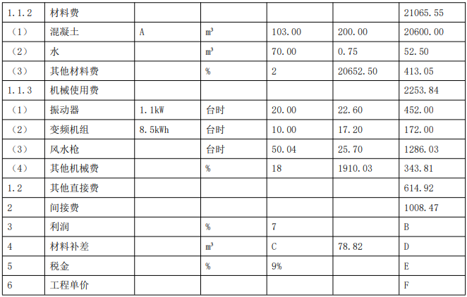 2.指出事件 2 排架 C25 混凝土单价分析表中,A、B、C、D、E、F 所代表的型号规格或数字(计算结果保留两位小数)。