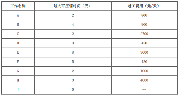 事件1:承包人在该泵站工程开工后第46天进度检查时发现,A工作和B工作以完成,已开始的C工作施工工期进度滞后5天,项目部根据赶工参数(如下表)对相关工作进行压缩,确保完工日期不变。