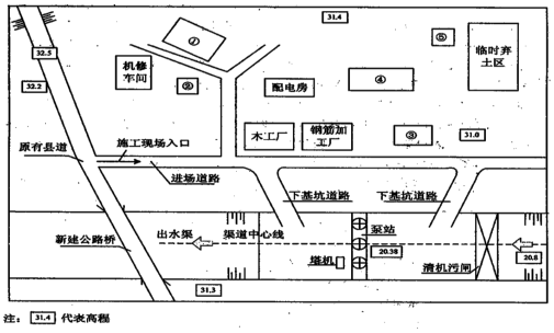 事件3:根据施工需要,本工程主要采用泵送混凝土施工,现场布置有混凝土拌合系统、钢筋加工厂、木工厂,预制构件厂、油料库等临时设施,其平面布置示意图如下。图中①、②、③、④、⑤为临时设施(混凝土拌合系统、零星材料仓库、预制构件厂、油料库、生活区)代号。