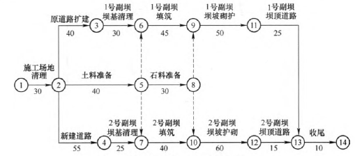 案例题 南方某以防洪为主,兼顾灌溉、供水和发电的中型水利工程,需进行扩建和加固,其中两座副坝(1 号和2 号)的加固项目,计划当年11 月10 日开工。副坝结构形式为黏土心墙土石坝。承包人拟定的施工进度计划如图1 所示。施工过程中发生了如下事件: