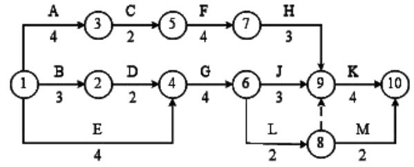 2.由于工作 A、G、H 共用同一台设备,三项工作间构成了紧前紧后关系,故在施工进度计划网络图中应增加两条虚工序:③-④之间添加一条虚工作,箭线由③指向④;⑥-⑦之间增加一条虚工作,箭线由⑥指向⑦。