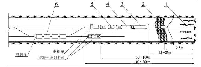1.1-气腿式风动凿岩机、2-耙斗、3-耙斗式装岩机(装载机)、4-皮带转载机、5-矿车重车线(重车线或重车)、6-矿车空车线(空车线或空车)。
