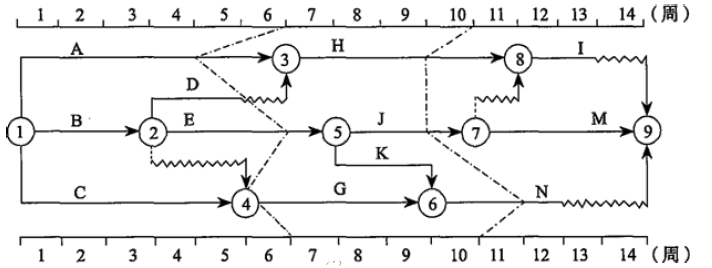 E 第10周末检查时,工作J拖后1周,不影响总工期