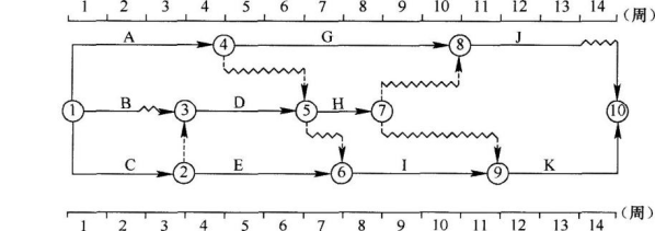 在所示双代号时标网络计划中,如果A、H、K三项工作共用一台施工机械而必须顺序施工,则在不影响总工期的前提下,该施工机械在现场的最小闲置时间是( )周。
