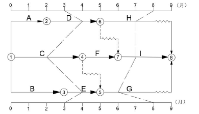 某工程进度计划执行到第3月底和第8月底的前锋线如下图所示,图中表明的正确信息有( )。