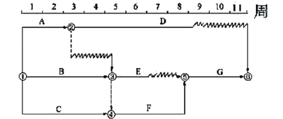 某工程时标网络图如下图所示。计划执行到第 5 周末检查实际进度。发现 D 工作尚需 3 周完成,E 工作尚需 1 周完成