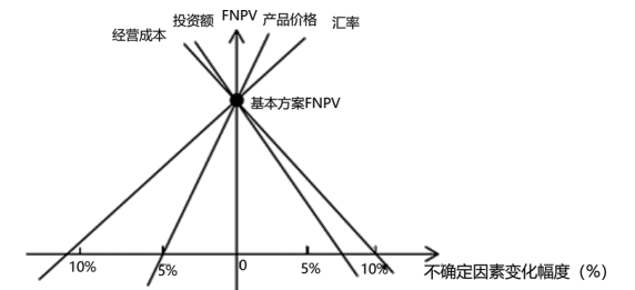 对某技术方案的财务净现值(FNPV)进行单因素敏感性分析,投资额、产品价格、经营成本以及汇率四个因素的敏感性分析如下图所