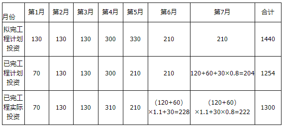 事件3:D、E工作受A工作的影响,开始时间也推迟了1个月,由于物价上涨原因,6~7月份D、E工作的实际完成投资较计划完成投资增加了10%。D、E工作均按原持续时间完成,由于施工机械故障,J工作7月份实际完成计划工程量的80%,J工作持续时间最终延长1个月。