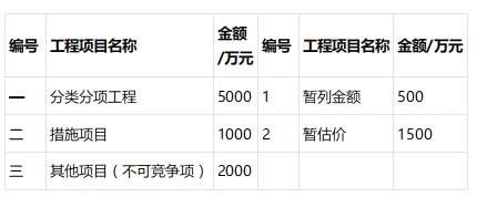 问题2: 分类分项工程:5000万元。 措施项目:1000万元。 暂估价项目:1600+(1600-1500)×9%=1609(万元) 暂列金额:450万元。 该工程合同价格:5000+1000+1609+450=8059(万元)