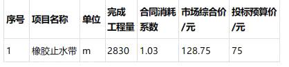 问题2: 橡胶止水带价差调整金额=完成工程量×合同消耗系数×(市场综合价或采购价一投标预算价)×(1+K) =2830×1.03×(128.75-75)×(1+9%)=170777(元)