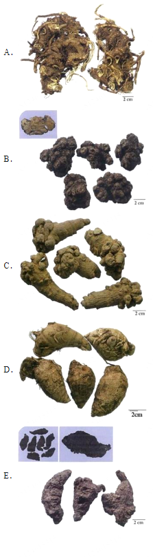 最佳选择题 图示中药为地黄的是( )。