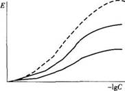 下图为拮抗药的量一效关系曲线图。虚线代表单用激动药的量一效曲线,实线代表拮抗药存在时激动药的量一效曲线图。E代表效应强度