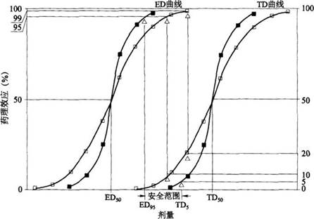 请根据A药和B药的量一效曲线(ED曲线)与毒一效曲线(TD曲线)图(■为A药,□为B药)判断下列表述中正确的有