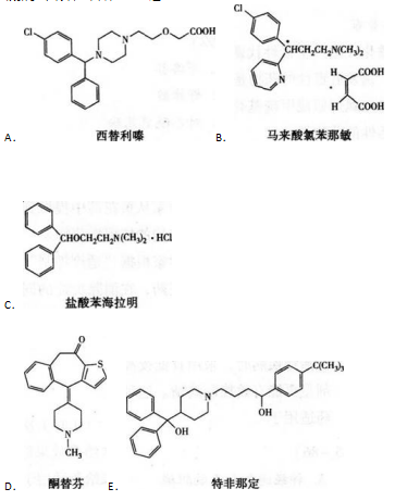 配伍选择题 哌嗪类,结构中含有羧基,体内易解离成离子,无中枢作用的H1受体阻断剂类抗过敏药是