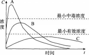 三种药物的血药浓度-时间曲线如下,对A、B、C三种药物的临床应用和生物利用度分析,不正确的是