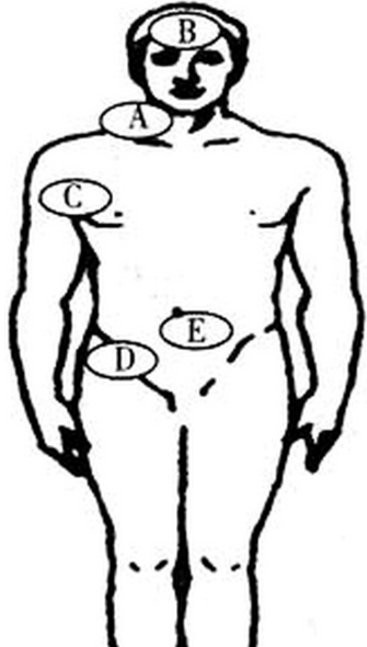 [A1、A2型题]患者男,40岁。发热38.3℃,行物理降温。图示的哪个部位不适合放置冰袋