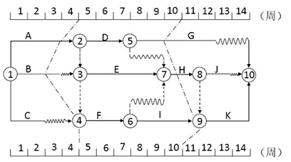某工程项目的双代号时标网络计划,当计划执行到第4周末及第10周末时,检查得出实际进度前锋线如下图所示,检查结果表明( )