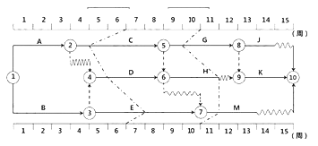 E 第 10 周末检查进度时,工作 H 已提前完成,不影响工期