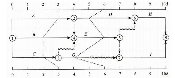 某分部工程时标网络计划如下图所示,当计划执行到第 3 周末时和第 6 周末时检查得到的实际进度如图中的实际进度前锋线所示
