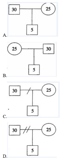 单选题 阿霞,25岁,老公小杜30岁,是一名装修工人。小杜工作辛苦,下班后喜欢喝酒减压,每次喝醉酒就对阿霞拳打脚踢,无法忍受家暴的阿霞带着5岁的儿子回到娘家生活。现在,阿霞的老公经常打电话骚扰阿霞家,让阿霞感到十分苦恼,于是她向社会工作者求助。社会工作者决定用家庭结构图来展现阿霞家的情况,正确的图形是( )。