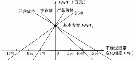 对某技术方案的财务净现值(FNPV)进行单因素敏感性分析,投资额、产品价格、经营成本以及汇率四个因素的敏感性分析如下图所示,则对财务净现值指标来说最敏感的因素是( )。