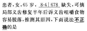 C 基托不密合,边缘密封性差或基托面积过小