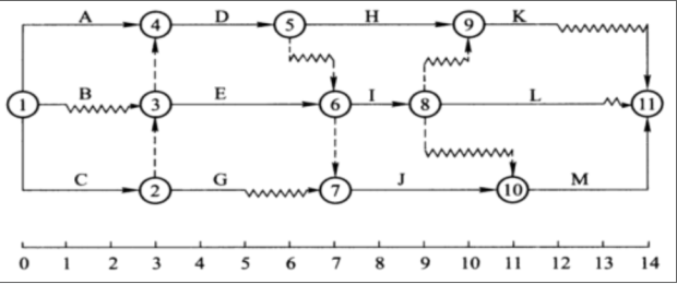 某工程工程双代号网络计划如下图所示,工作E最早完成时间和最迟完成时间分别是()