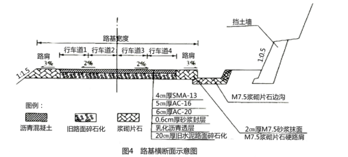 某双向四车道一级公路运营10年后,水泥混凝土面板破损严重,拟进行改建,设计方案为:对旧水泥混凝土路面采用碎石化法处理,然后加铺沥青混凝土面层,同时在公路右侧土质不稳定的挖方路段增设重力式挡土墙面及碎落台(如图4所示)。某施工单位通过投标承接了该工程。