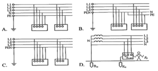 单选题 保护接零系统又叫作TN系统,N表示电气设备在正常情况下不带电的金属部分与配电网中性点之间直接连接。TN系统又分为TN-S、TN-C-S、TN-C三种情况,下列图中表示TN-C-S系统的是( )。