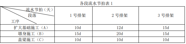 案例题 某施工单位承接了一 4×20m 简支梁桥工程。桥梁采用扩大基础,墩身平均高 10m。项目为单 价合同,且全部钢筋由业主提供,其余材料由施工单位自采或自购。在离本工程不远的江边有丰 富的砂源,经检验,砂的质量符合要求。采砂点位于一跨江大桥下游 150m 处,施工用砂均取自这 里。项目部拟就 1~3 排架组织流水施工,如下表所示。
