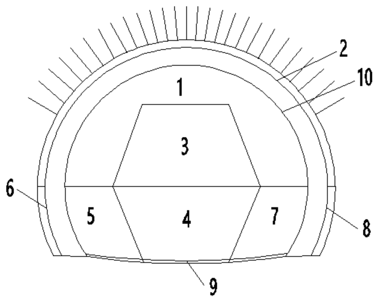 2、图4中1-上弧形导坑开挖(环形拱部开挖),2-拱部初期支护,3-预留核心土开挖,5-下台阶侧壁部开挖,6-下台阶侧壁初期支护,9-仰拱超前浇筑,10-全断面二次衬砌。